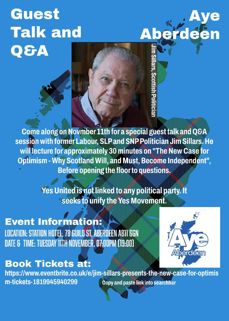 Aye Aberdeen will be hosting Jim Sillars on Tuesday 11th November 7pm, in the Station Hotel, 78 Guild Street, Aberdeen, AB11 6GN. In this special guest talk, he’ll share his compelling vision for “The New Case for Optimism - Why Scotland Will, and Must, Become Independent”, drawing on his wealth of experience as a former Labour, SLP, and SNP politician. Tickets are FREE but must be reserved at https://www.eventbrite.co.uk/e/jim-sillars-presents-the-new-case-for-optimism-tickets-1819945940299