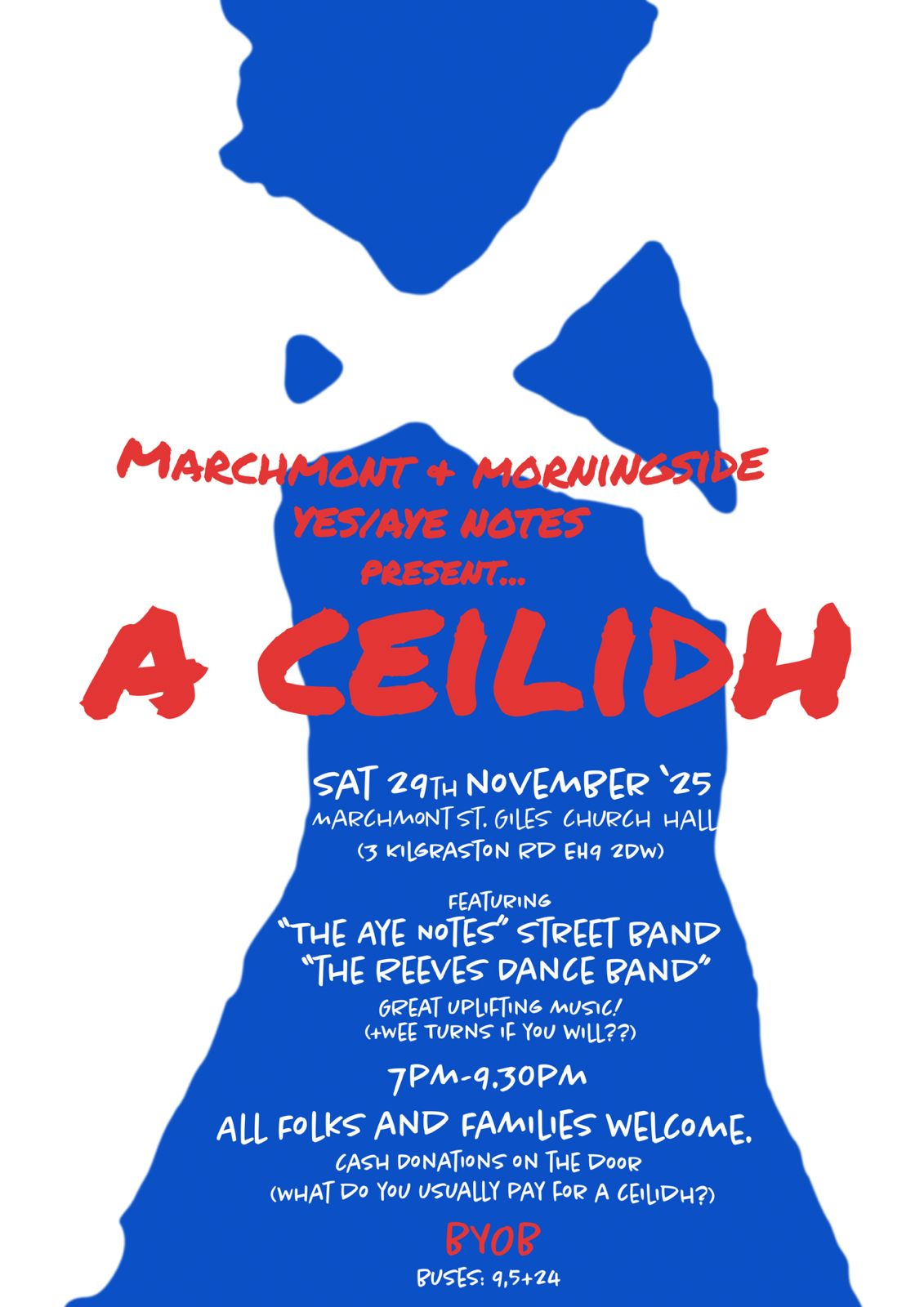 Yes Marchmont and Morningside are holding a Ceilidh featuring The Aye Notes Street Band on Saturday 29th November in Marchmont St. Giles Church Hall, Kilgraston Road, Edinburgh from 7pm-9.30pm. This is an informal social/family event for people who share the YES ideal. Tickets by donation, available at the door, BYOB.